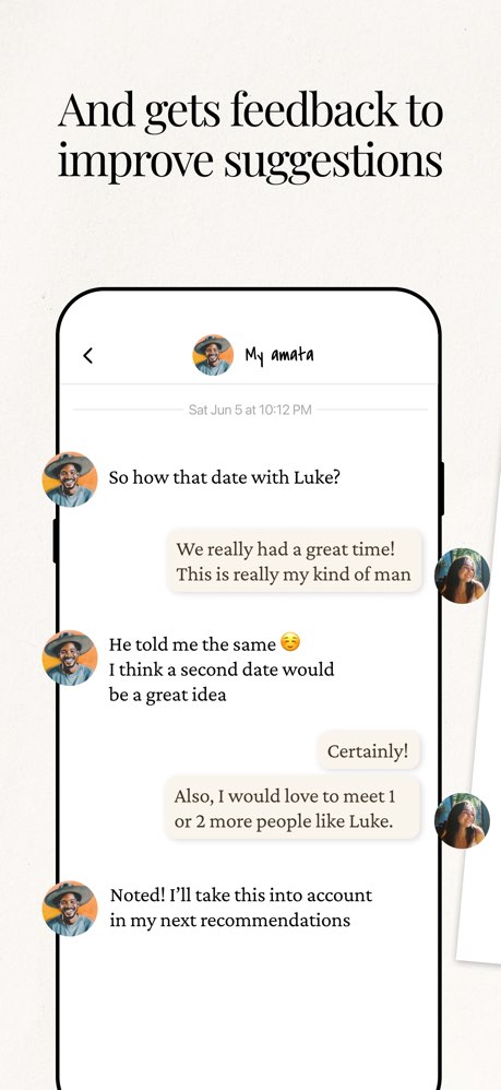 Download the app and start a conversation with your AI matchmaker. It asks about your lifestyle, values, what you're looking for, and what you're not — building a real picture of who you are beyond a photo grid. When the AI finds someone it thinks is a strong fit, it introduces you both. If you're both interested, Amata handles the logistics: it checks your availability and books a table at a curated restaurant. You show up, have the date, and then debrief with your AI afterward. Every piece of feedback sharpens future matches.