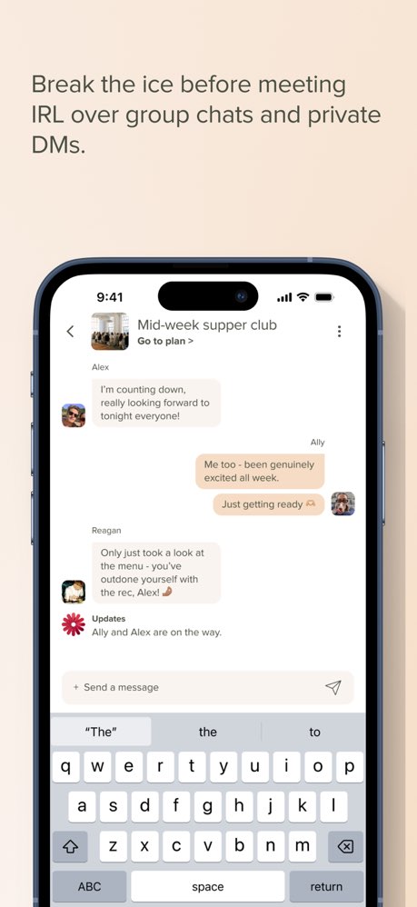 Download the app and create a profile. Browse plans others have posted — anything from dinner parties to run clubs to coffee catch-ups — or host your own by setting the activity, time, and location. When someone wants to join your plan, they send a request and you decide who to accept. Show up, do the thing, and meet people who are genuinely into the same stuff. After the plan, you can stay connected through the app or just show up to the next one.