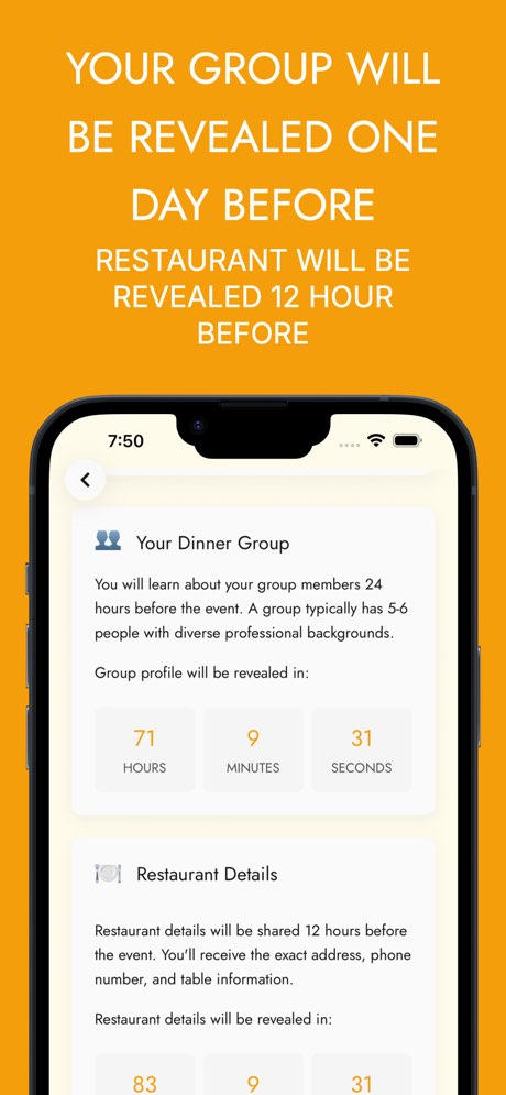 Still relatively new — no public ratings yet on the App Store. iOS only, no Android app. No structured post-dinner community or follow-up features. Restaurant selection may be limited in newer cities.