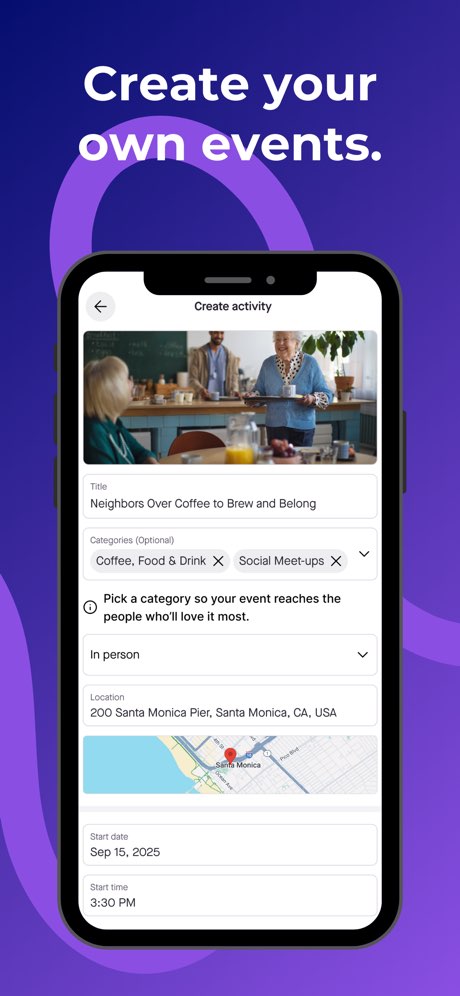 Adults 55+ who are retired or semi-retired and want a fuller social calendar. People who've recently moved or lost a spouse and need to rebuild their social circle. Active older adults who want to try new things — hiking groups, art classes, wine tastings — with people their age. Anyone who finds mainstream social apps too young, too chaotic, or too focused on dating.