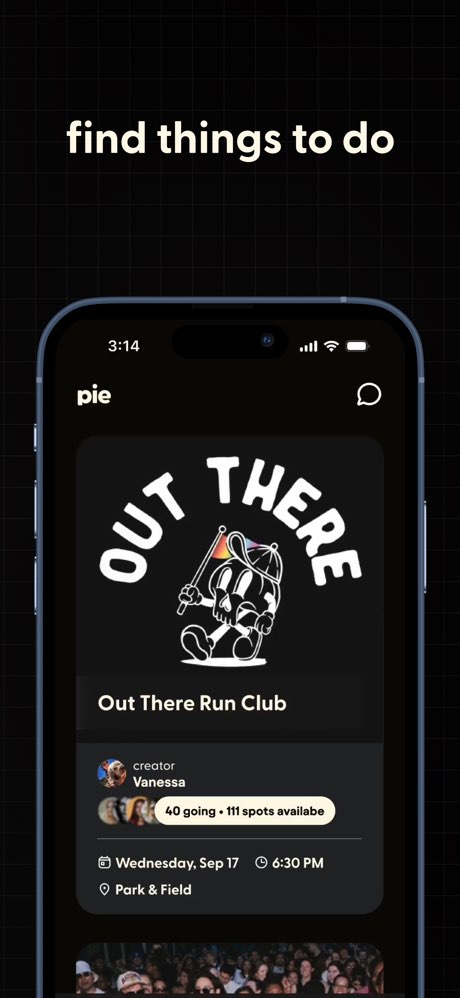 Pie is a free social app that connects you with in-person events and like-minded people in your city. Instead of swiping on profiles, you browse a curated feed of local happenings — DJ sets at coffee shops, trivia nights, social clubs, pickup sports — and show up. The more events you attend, the more the app learns who you click with, building a personalized social graph of friends and friends-of-friends. It's less about matching and more about getting you out the door.