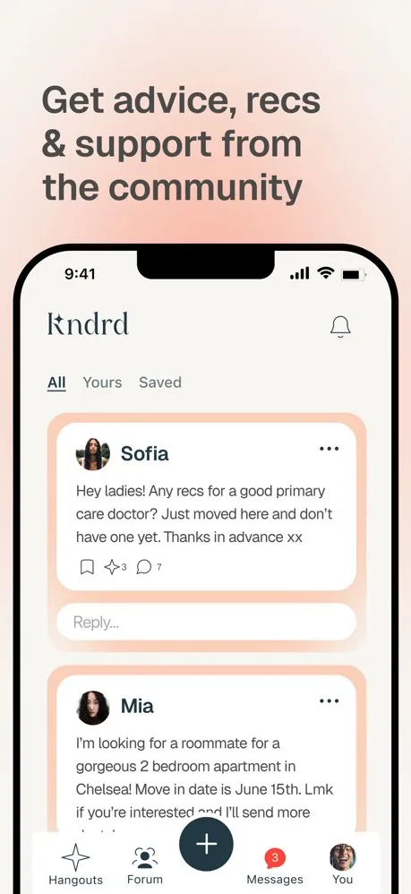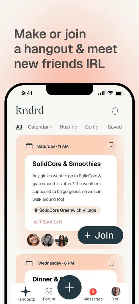 Download the app and apply to join — every member is reviewed by the Kndrd team, so expect a short wait. Once you're in, browse plans that other members have posted: anything from after-work drinks to weekend hikes to concert outings. See something you like? Join it, and a group chat auto-generates so you can coordinate details. You can also create your own plan and let the community come to you. There's also a Forum section where you can ask for recommendations, find roommates, or get advice from the community.