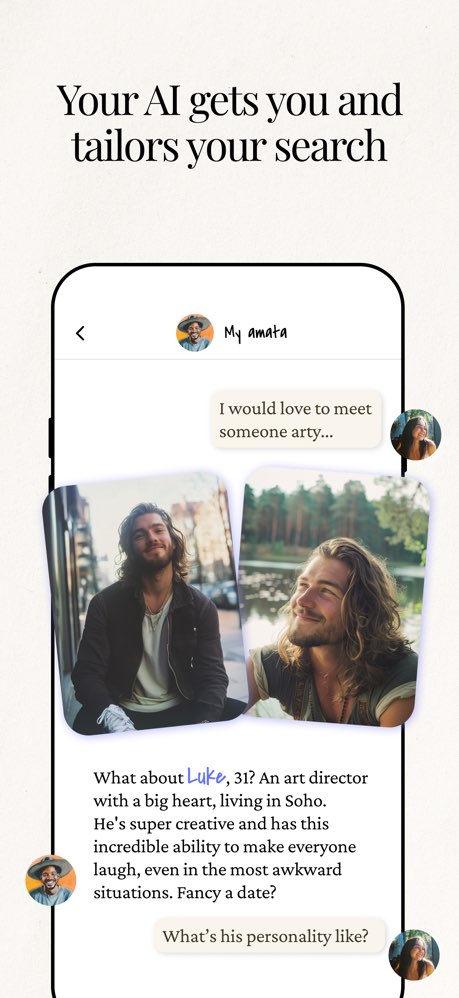 Download the app and start a conversation with your AI matchmaker. It asks about your lifestyle, values, what you're looking for, and what you're not — building a real picture of who you are beyond a photo grid. When the AI finds someone it thinks is a strong fit, it introduces you both. If you're both interested, Amata handles the logistics: it checks your availability and books a table at a curated restaurant. You show up, have the date, and then debrief with your AI afterward. Every piece of feedback sharpens future matches.