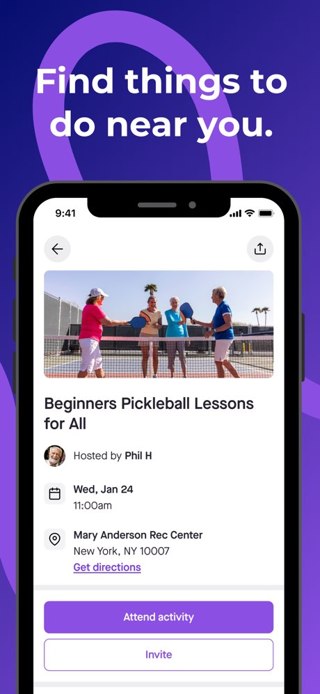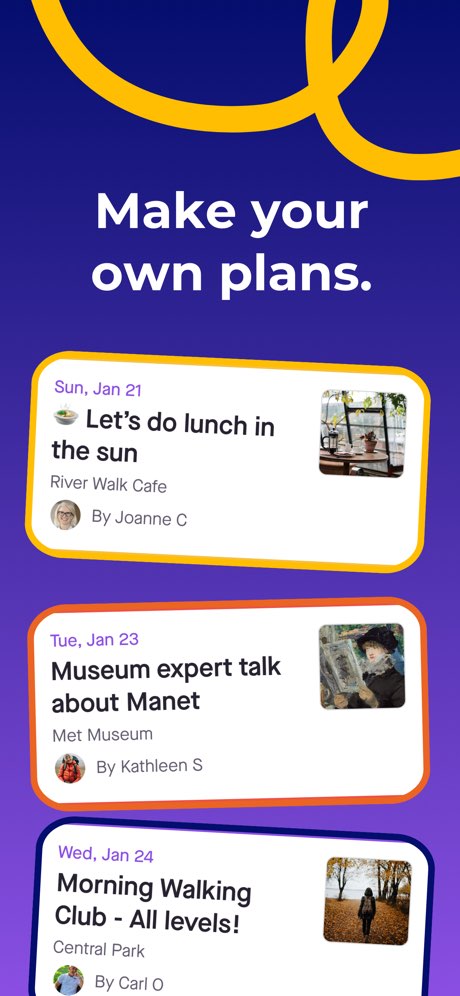 Adults 55+ who are retired or semi-retired and want a fuller social calendar. People who've recently moved or lost a spouse and need to rebuild their social circle. Active older adults who want to try new things — hiking groups, art classes, wine tastings — with people their age. Anyone who finds mainstream social apps too young, too chaotic, or too focused on dating.