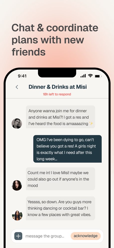 Women in NYC who want to meet new people through actual activities, not just swiping. People who are spontaneous and prefer 'let's do something tonight' over planning weeks ahead. Anyone new to the city who wants a vetted, trustworthy community to plug into. Social butterflies who are tired of apps that feel like dating platforms repackaged as friend-finders.